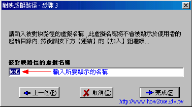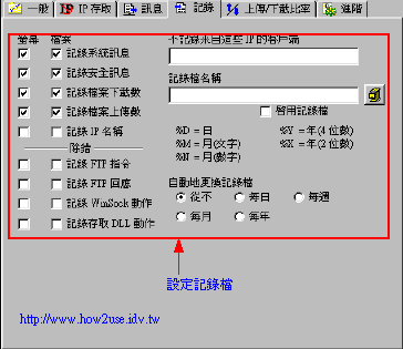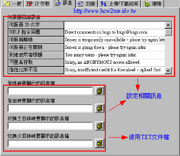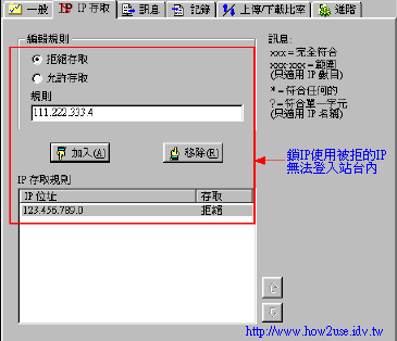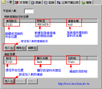 FTP站台設定 1.一般:這裡是設定可登錄人數、虛擬目錄、連結捷徑目錄 虛擬目錄(圖的上半部):用來分享各磁碟的連結,如下圖範例登錄者登錄啟始目錄G:\abc會出現一個資 料夾test2連結到F:\123內,啟始目錄也可用 %HOME% 來代替。 連結捷徑目錄(圖的下半部):用來當進錄不同磁碟時進行切換的目錄捷徑,如下圖在F:\123會出現一個 名稱為back的資料夾,此時如 果登錄者按back這資料夾就會回到G:\abc內 ![]() 虛擬目錄加入步驟: a. ![]() b. ![]() c. ![]() 2.IP的鎖定,可以使搗蛋者無法再登錄你的站,但對動態IP似乎不管用。 (站長在測試時隨便輸入鎖住一個IP,然後在自己登錄自己的測試站卻發現一直呈現插座已連接但一直 無法進入站內的怪事,明明不是被鎖的IP但卻無法登錄,不知是設定有誤還是程式的Bug,一把封鎖的 IP刪除就又可正常登錄了) ![]() 3.訊息:設定一些登錄或切換目錄出現的訊息 ![]() 4.記錄 ![]() 5.上傳/下載比率: ![]() |