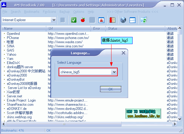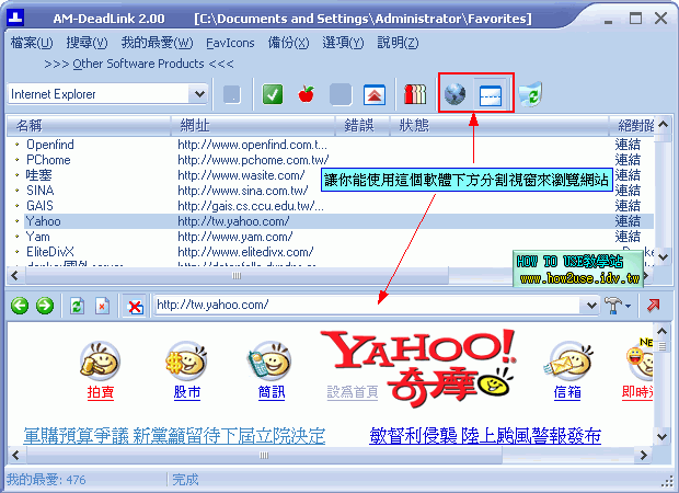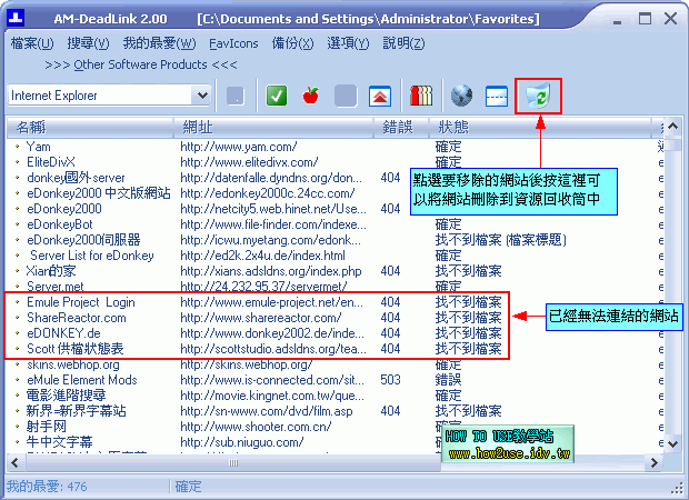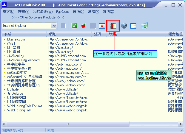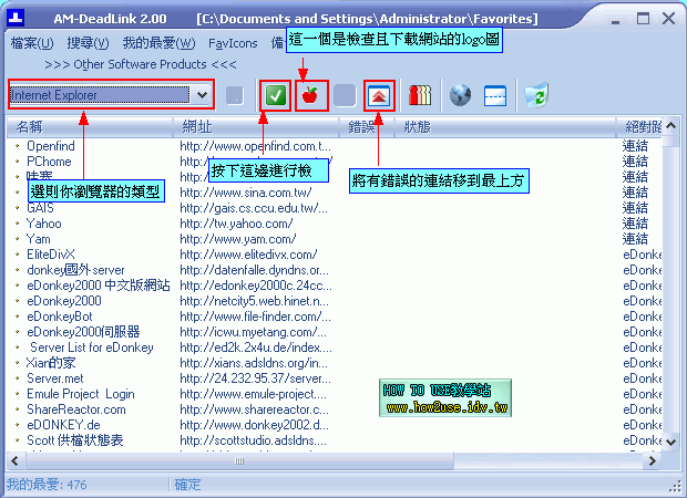前言: AM-DeadLink是一個可以測試瀏覽器內我的最愛的連結是否都已失效的軟體,支援IE及Netscape、Opera瀏覽器 使用軟體: 【軟體名稱】:AM-DeadLink 【軟體網站】:http://www.aignes.com/ 【軟體下載】:軟體下載 教學項目: 1. 軟體安裝完第一次執行時先設定軟體語言介面,如果沒有出現可以到選單[Options]內設定 ![]() 2.選定你了瀏覽器類型後,就會列出你的網站 3.可以看是否有重覆的網站 4.使用分割視窗觀看網站 5.檢查完避後出現的網站狀況!你可以將失效的刪除,如果不確定可以用上面的分割視窗看一下網站情況 |