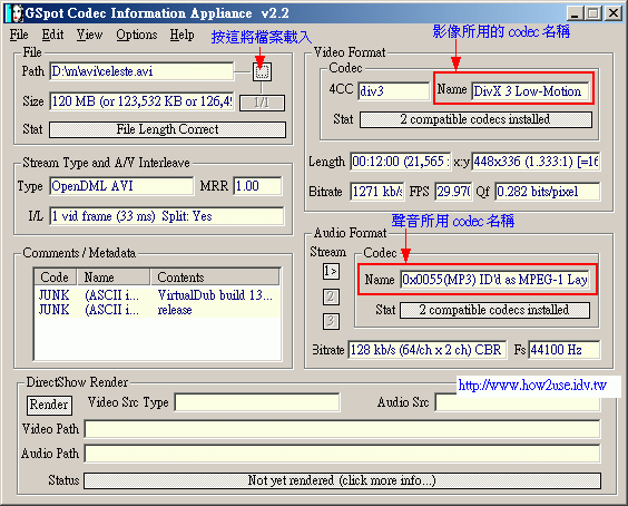 2.接著將有問題無法播放的avi檔載入查看所需要的codec