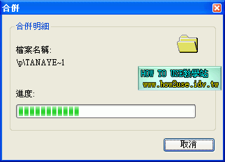 7. 經過分割的檔案下載後會出現很多分割檔,其中有一個副檔名為p2m的,點選檔案後會出現合併視窗