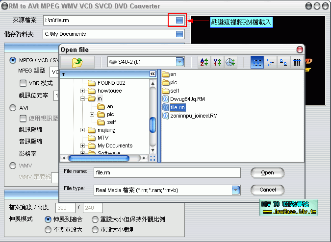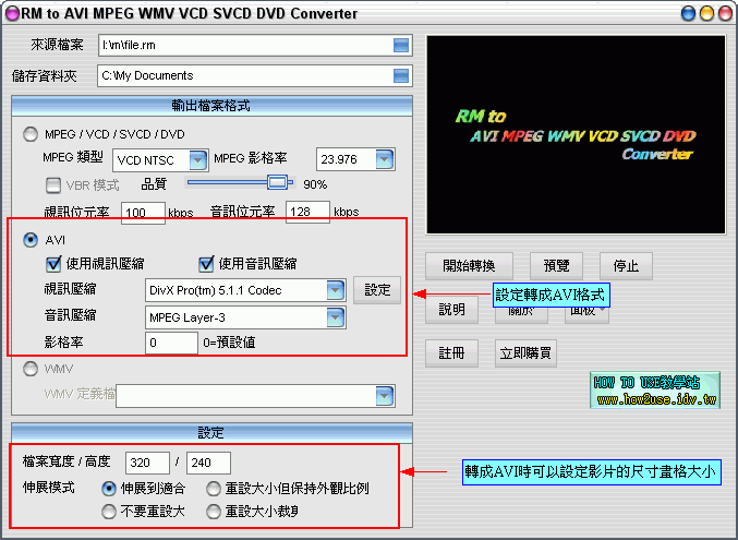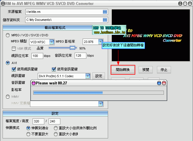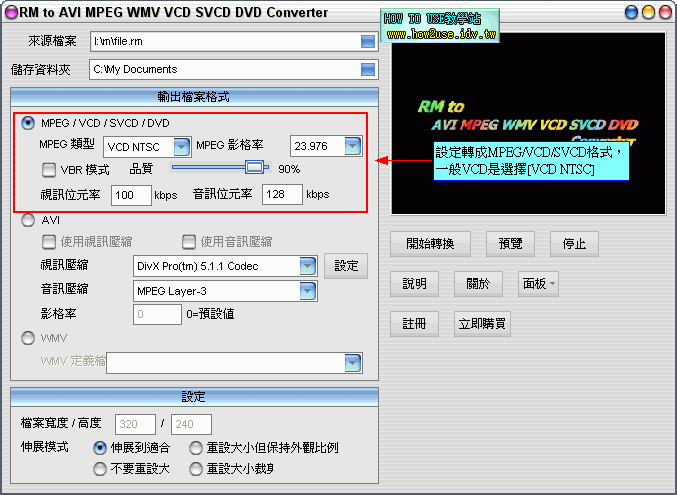 前言: RM to AVI MPEG WMV VCD SVCD DVD Converter 是一個用將RM檔轉檔的軟體,可以轉換成許多不同的 多媒體檔案格式,也有支援RMVB的轉檔。 【軟體名稱】:RM to AVI MPEG WMV VCD SVCD DVD Converter 2.設定RM轉成MPEG/VCD/SVCD/DVD轉檔的格式 3.設定轉成AVI檔的設定 4.設定好你要轉檔的格式後,就可以開始轉檔 5.轉檔時雖然會出現要你註冊的對話視窗,你只要隨便輸入名稱和註冊碼還是可以完整轉完檔案 |